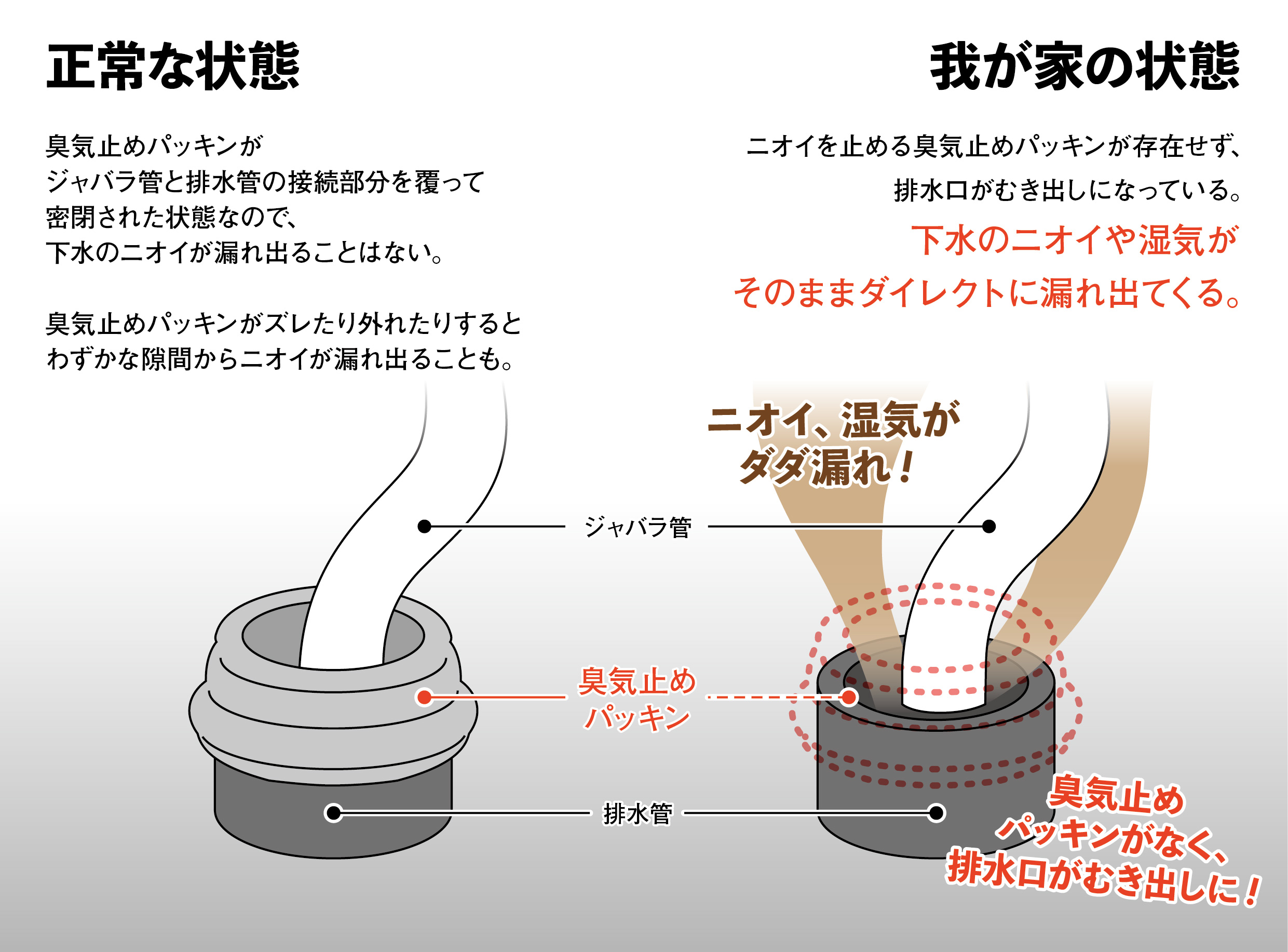 説明書に従い、排水管とジャバラ管の間にパッキンを取り付ける作業は10分ほどで終了。その後、臭いはぴったりとおさまったのです。