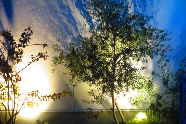 低木の常緑樹の場合は、広角ライトを使用すると全体を上手く照らすことができます。ライトアップの方法にはいくつかありますが、植物全体のシルエットを美しく壁面に投影したい場合は「シャドウライティング」を、葉のシルエットを美しく見せたい場合は「シルエットライディング」が効果的です。