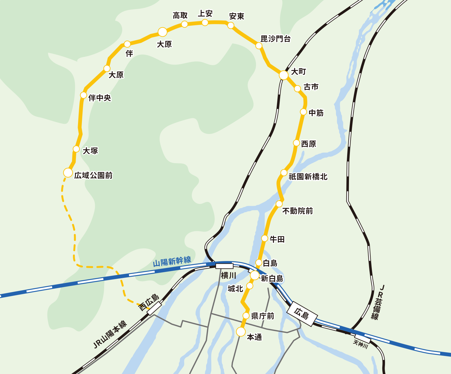 安佐南区の住宅街のある東部をぐるりと回って、広島市の中心部・紙屋町(かみやちょう)や本通(ほんどおり)まで繋がっているアストラムライン。この地域の慢性的な渋滞の解消を目的とし、1994年に開催されたアジア大会に合わせて開業した比較的新しい新交通システムです。