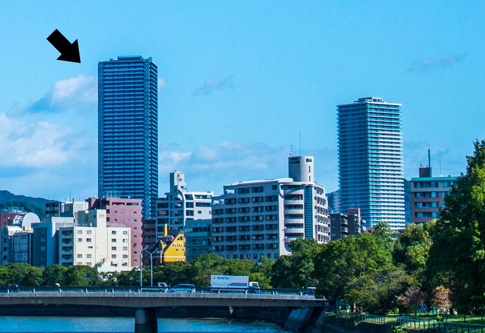 広島の中心部、上八丁掘(かみはっちょうぼり)に2004年に完成したタワーマンション。地上166.6m、43階建という、当時広島県で一番高いビルとして話題になりました。2016年に広島駅前の「シティタワー広島」と「グランクロスタワー広島」に抜かされるまで、12年間1位の座を守り続けた超高層マンションです。