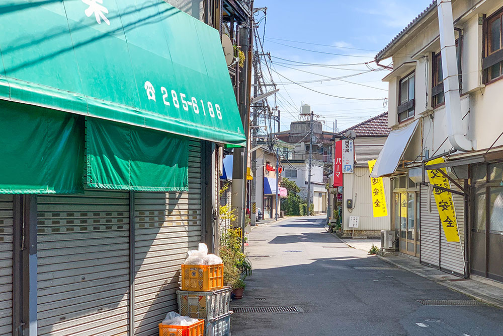 府中町大通りのトライアングルの南側を通る県道84号線から一本路地を分け入ると、個人経営の青果店や散髪店、美容室、居酒屋、喫茶店など、昭和の時代を感じることのできるお店が数多く残っています。