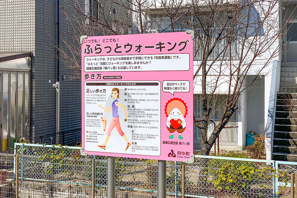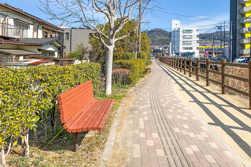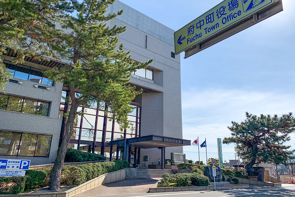 府中町の町役場は、府中町内を流れる3つの河川「府中大川」、「榎川(えのきがわ)」、「八幡川(やはたがわ)」が合流する地点のすぐ近くにあります。八幡川のほとりには、お散歩族には嬉しいベンチやグリーンなどがある美しい遊歩道が伸びています。