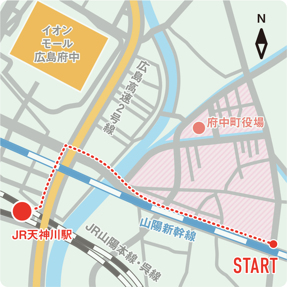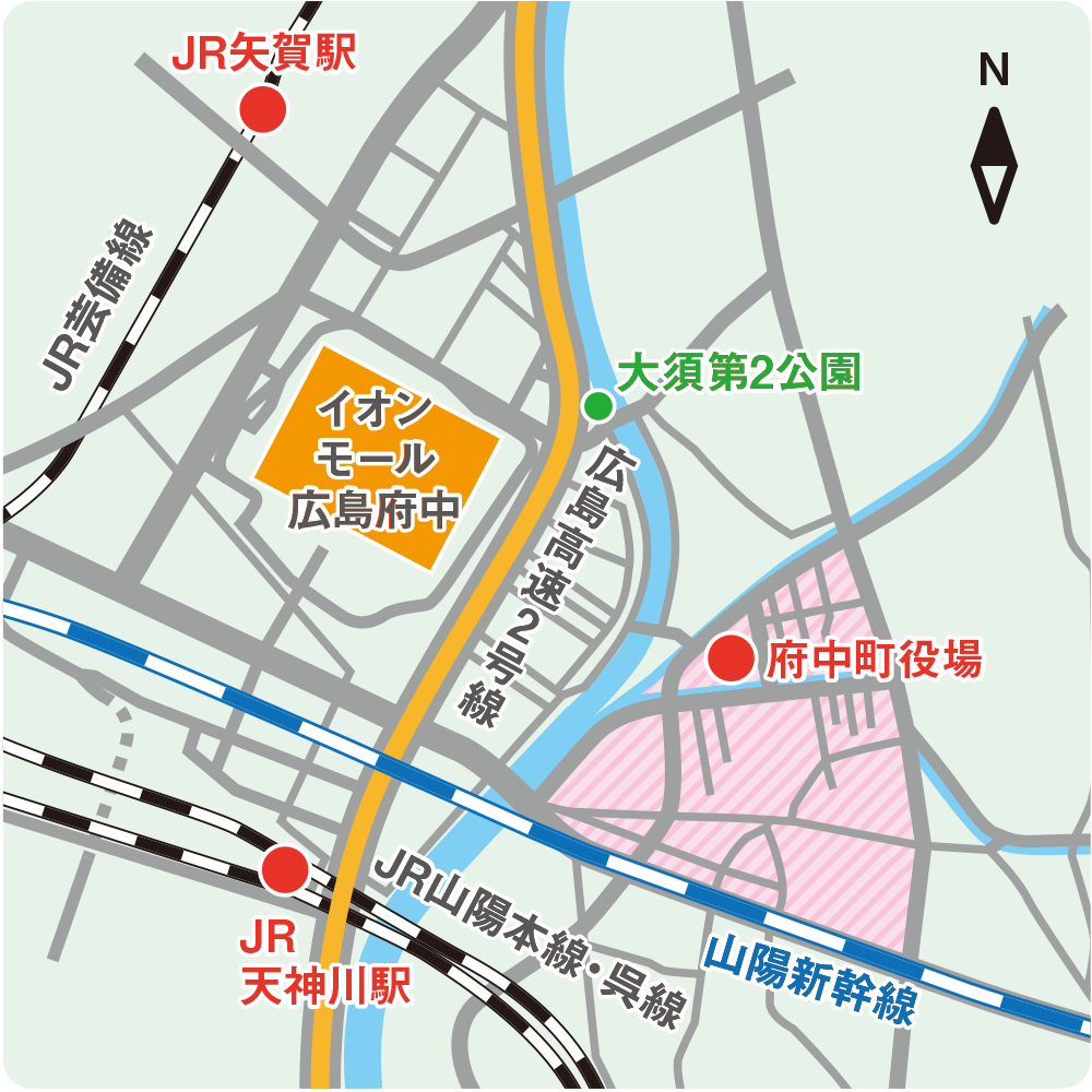 大通から府中大川を渡ってわずかに南に進むと、JR山陽本線・呉線の2路線を利用可能な「天神川駅(てんじんがわ)」があります。一番距離の遠い大通3丁目にある賃貸物件から天神川駅までの徒歩の所要時間は公称「13分」。