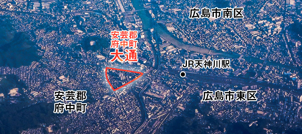 空から見た府中町大通は、ほぼ三角形の印象的な形をしています。このシンボリックな形をしたエリアを歩き、現在の姿を見ていきましょう。