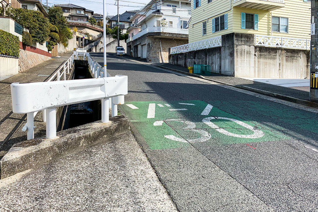 メインストリートを左折し、さらに山の上に向かって登っていく道に入ると、道路に謎の「ゾーン30」という表示があります。