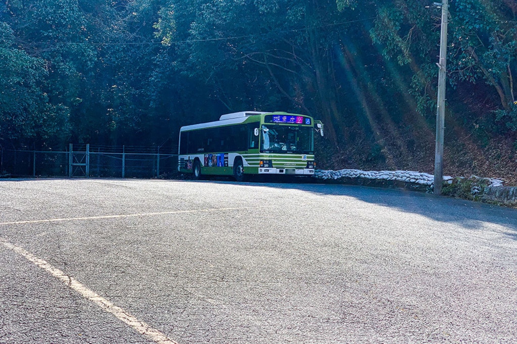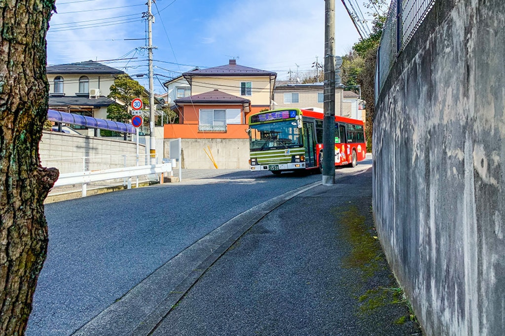 4丁目の坂を登ると、団地内を走る路線バスの終点・「府中ニュータウン」があります。バス停よりやや先に進むと、バスがUターンして控えている場所がありました。