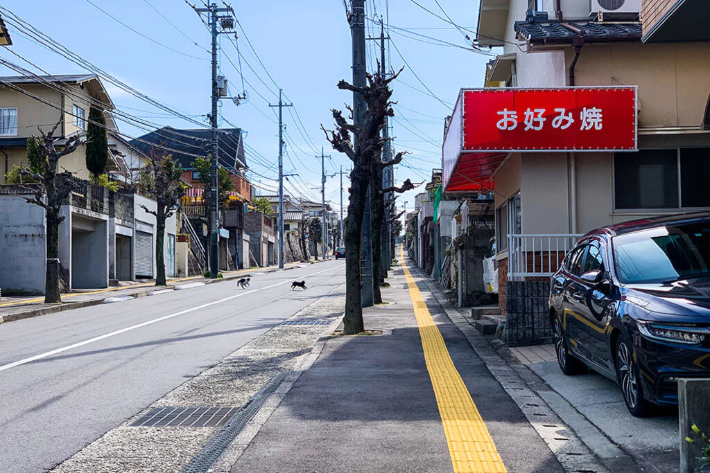 メインストリートは平日の昼間でもそこそこ車が通っていますが、ネコが元気に走り回っていたり、タヌキの子どもが人間を怖がるそぶりもなく闊歩していたりと、山が近い瀬戸ハイムならではの風景が広がっています。