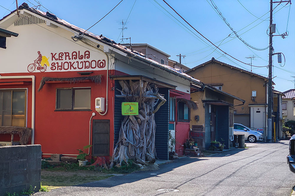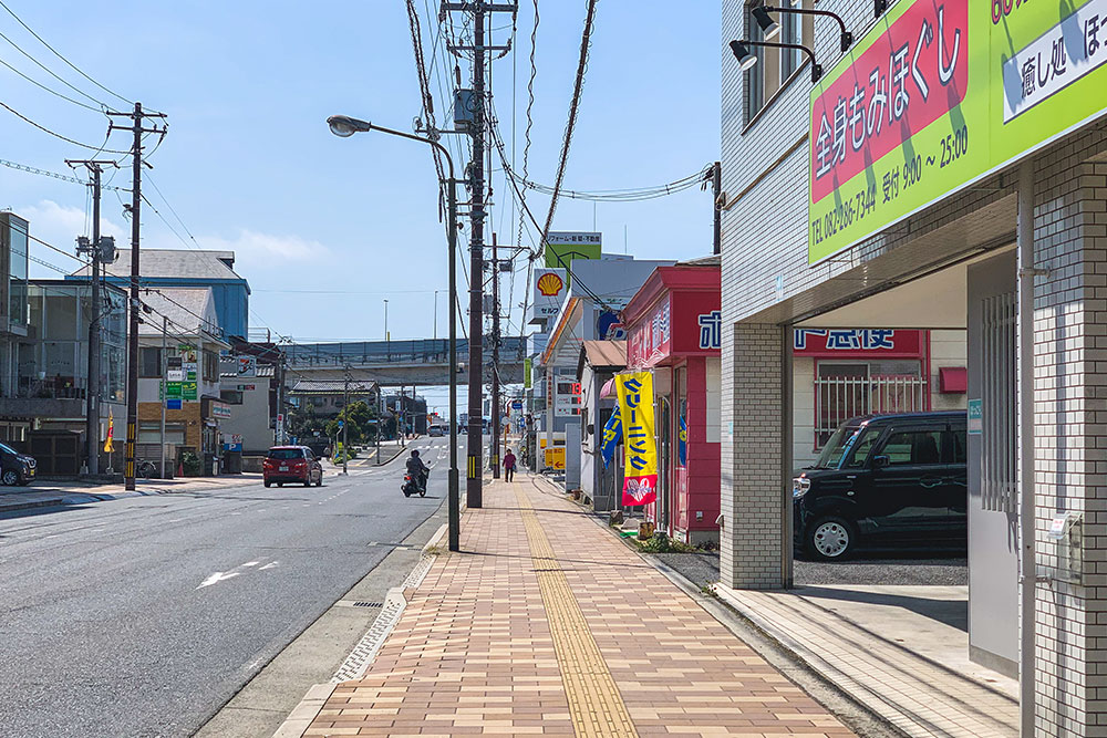 道路沿いには商店や飲食店が立ち並ぶ