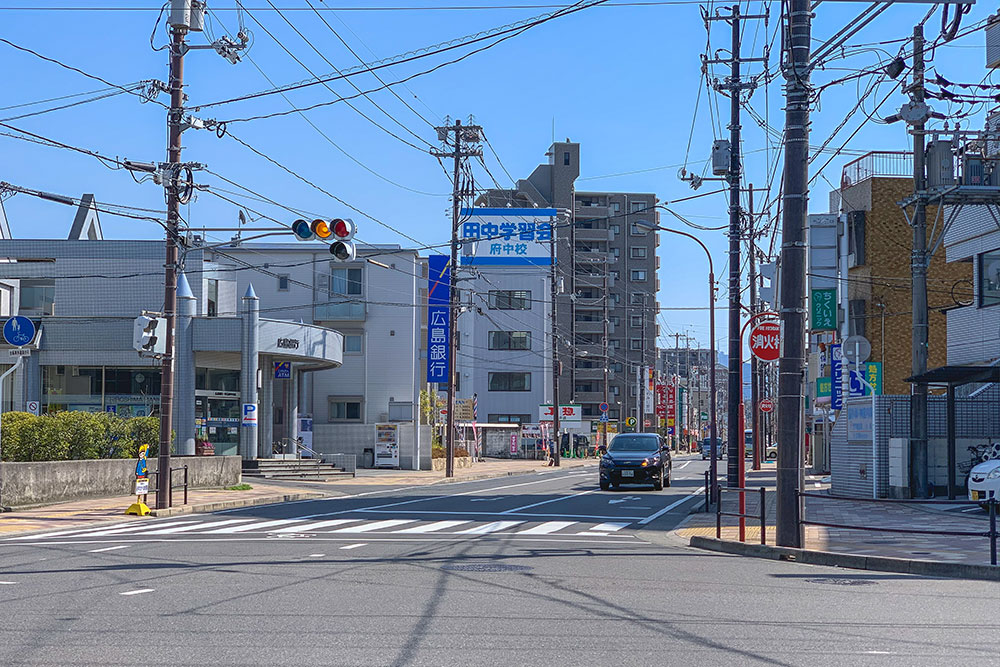 鶴江エリアには、広島市の温品(ぬくしな)や中山(なかやま)へと通じる県道152号線や、隣の本町と大須、高台エリアの城ケ丘(じょうがおか)やみくまり方面へと通じる道路が集中しており、車で様々な場所へ行くのがとても便利になっています。