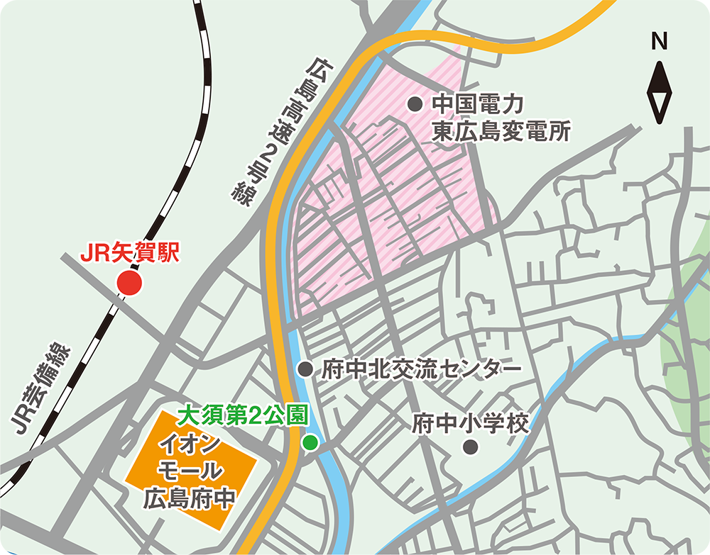 エリアはほぼ全て平地で、徒歩や自転車で移動することができるようになっています。街の東隣はイオンモール広島府中のある大須(おおす)エリア、南隣は古くからの中心地である本町(ほんまち)エリアに接していて、日常生活を送るにはとても便利な場所と言えます。