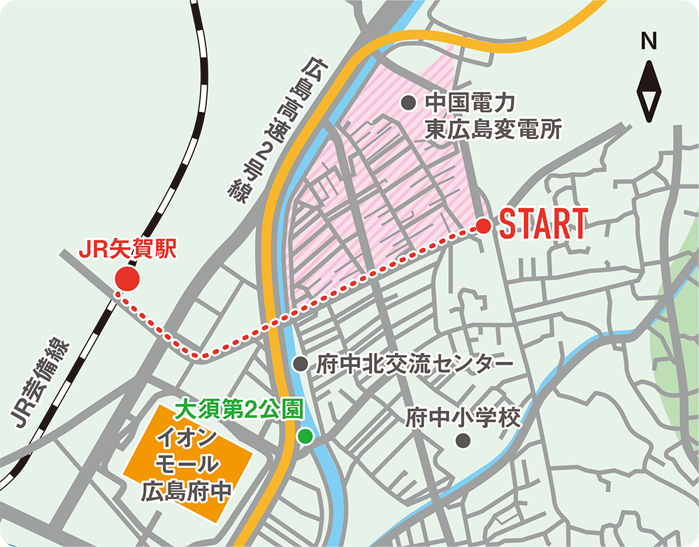 JR広島駅まで一駅・所要時間4分でアクセスできるJR芸備線(げいびせん)の矢賀駅(やがえき)。鶴江からは平らな土地を歩き、府中大川を渡るだけでアクセス可能です。