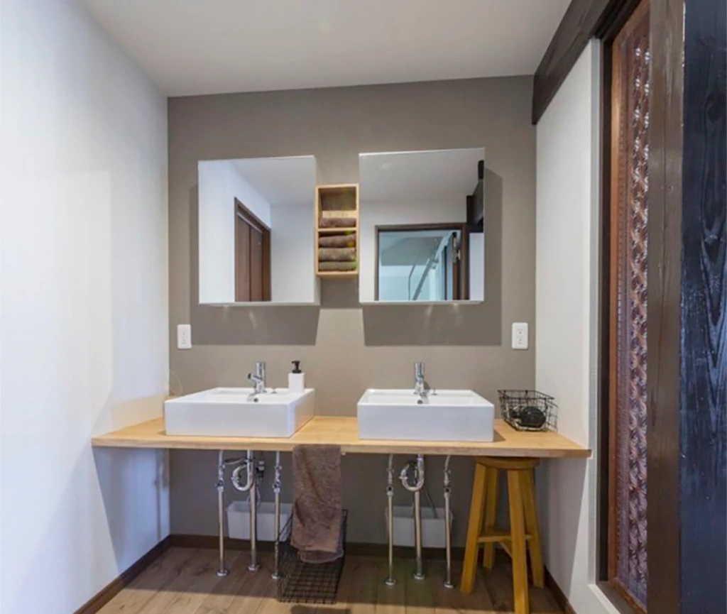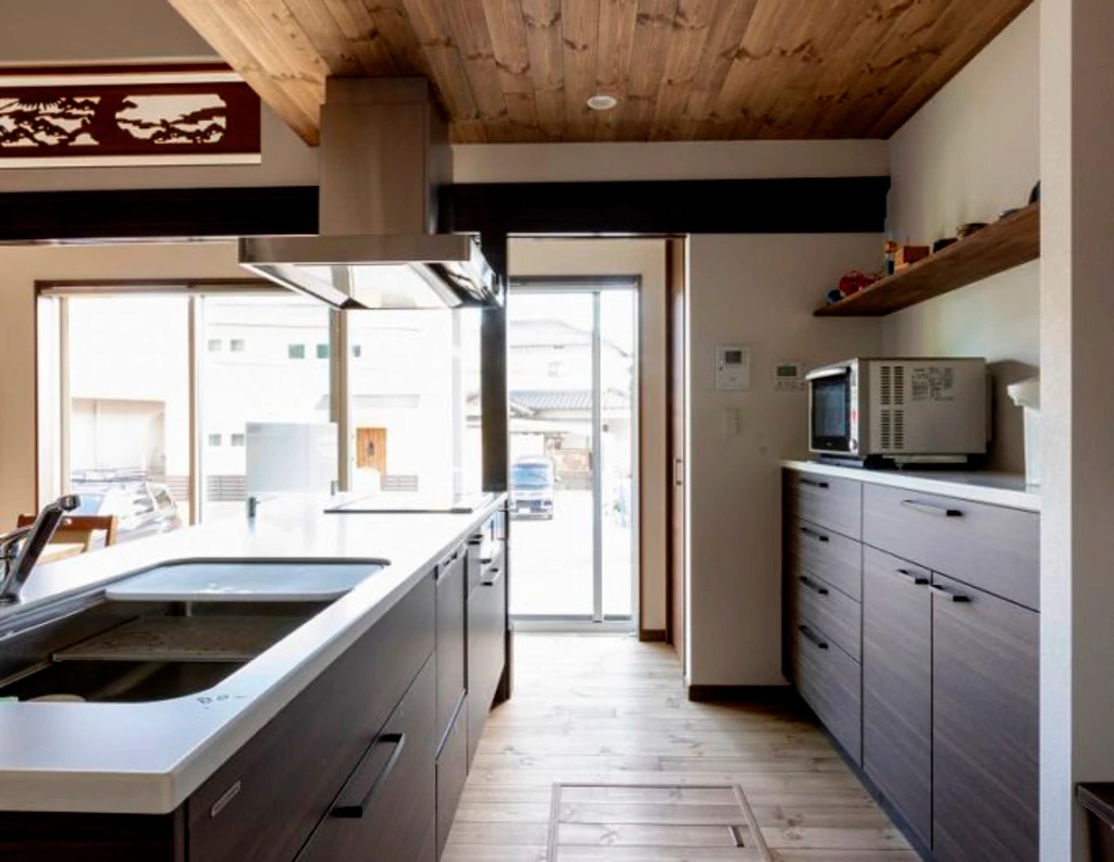 古民家の水回りは配管が劣化していることがあります。長く快適に古民家ライフを楽しむためにも、配管などは事前にチェックしておきましょう。 機能面を考慮したリノベーションを行うことで、使い勝手の良い現代風のキッチンになるだけでなく、色を建具と合わせると、 ”和洋折衷のおしゃれなキッチン”となります。