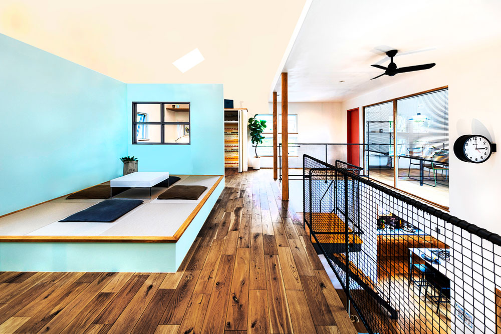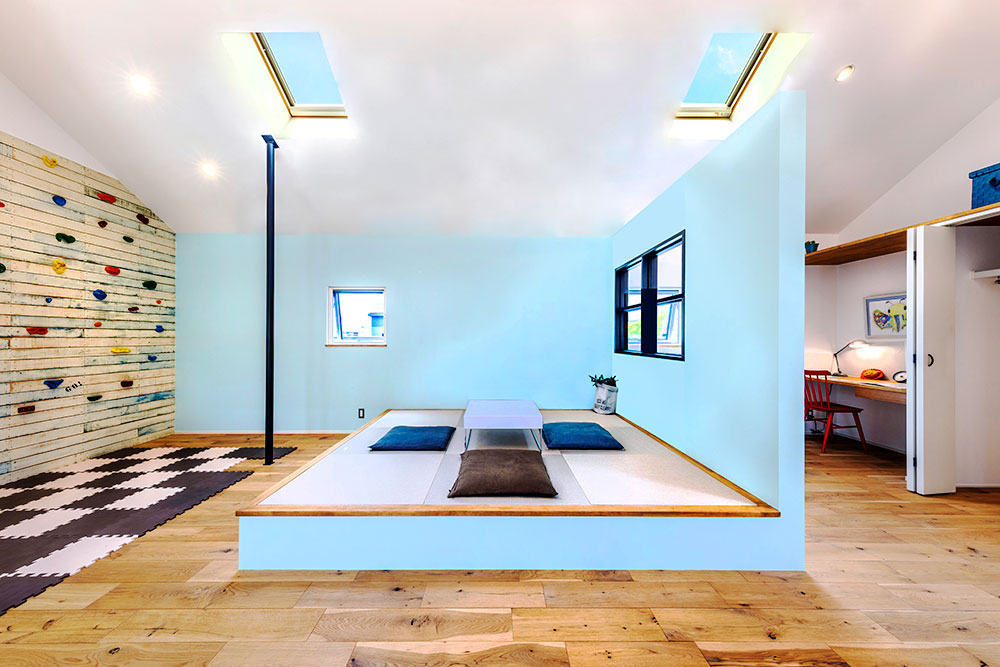 こちらは小上がりの畳スペースの壁が淡い水色に塗られています。ほっと一息入れる際は、リラックス効果のある水色の空間が癒しを与えてくれることでしょう。天窓から見える青空がそのまま室内に取り込まれたような、開放感あふれる幻想的な空間になっています。