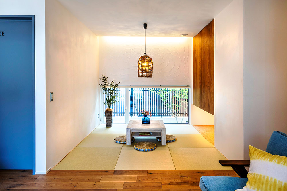 リビングから続く畳スペースには、ヴィンテージ感のあるローテーブルの上にブルーの花瓶やサイドにブルーがあしらわれた丸ざぶが配置され、海を感じさせるリビングの雰囲気が継承されています。