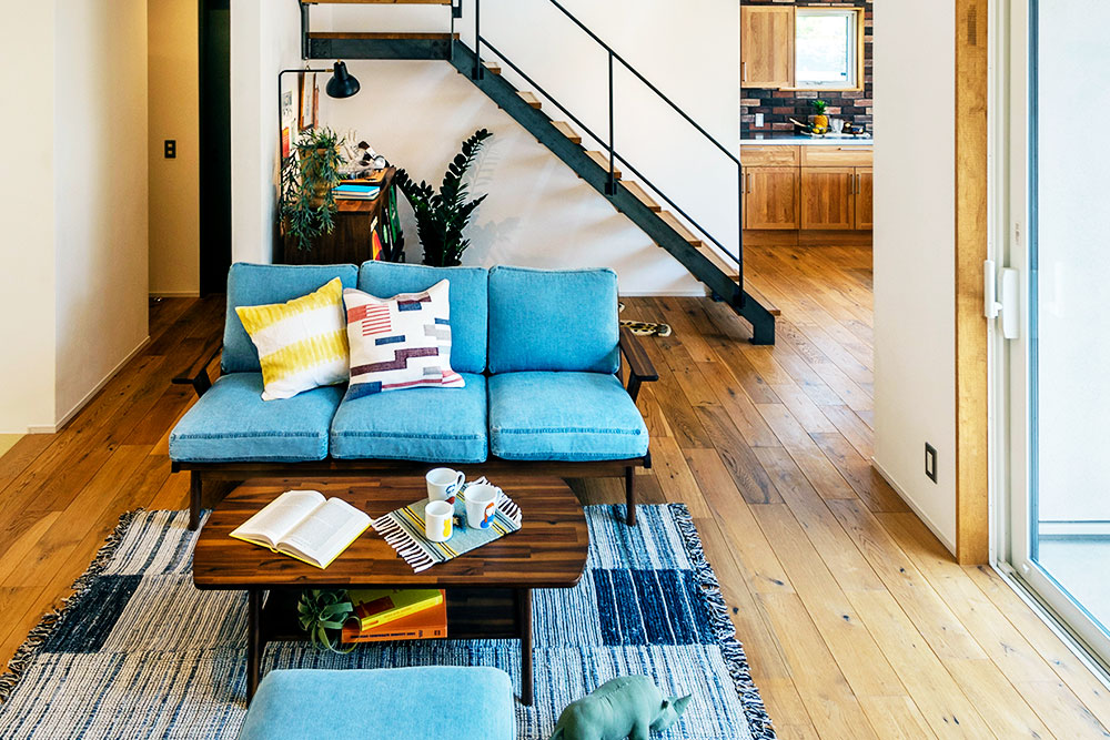 無垢の床材と白壁、黒いアイアンの手すりといったシンプルかつアーバンな雰囲気のある内装のお部屋に、淡いブルーのソファとラグを配置したリビング。ヴィンテージ感のある家具や小物で統一され、ビーチリゾートを連想させる開放感あふれる空間に仕上げられています。