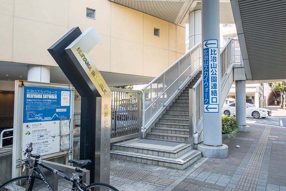 比治山スカイウォークは、段原中央の交差点から比治山トンネルに向かう道路の歩道に入口があります。また、前述の通り、道路沿いの段原ショッピングセンターの3階からも直通で利用できるようになっています。