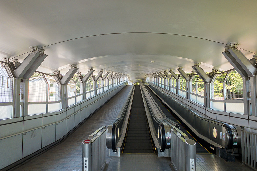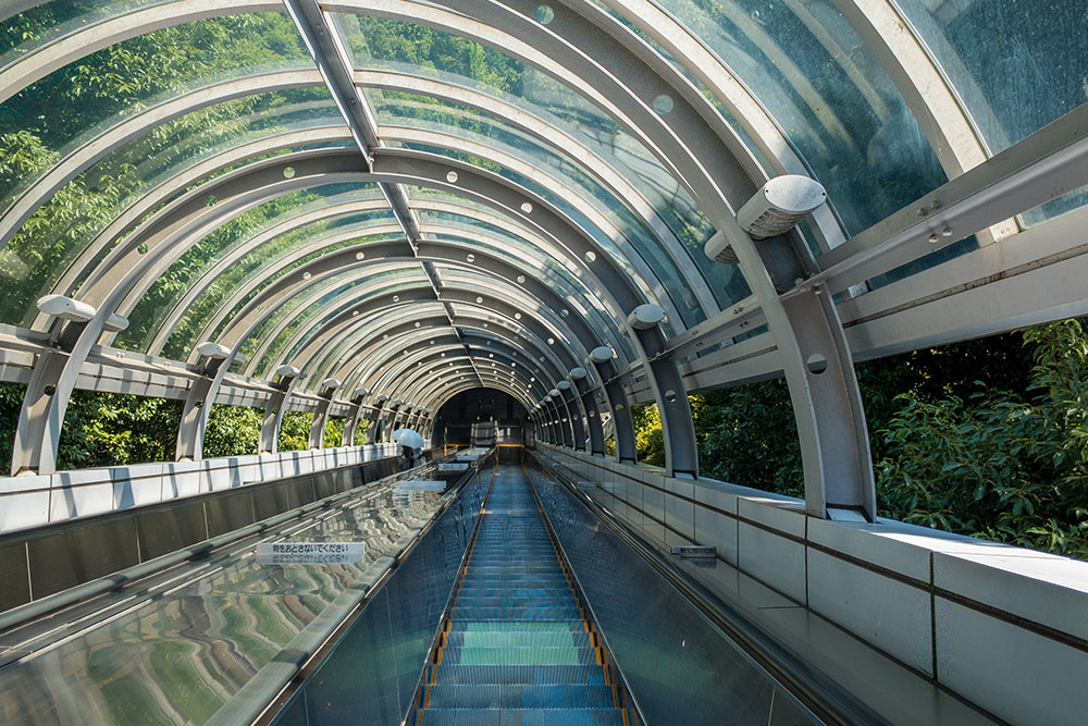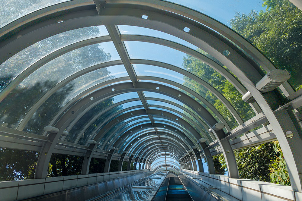 「スカイウォーク」の名の通り、エスカレーターの終点近くの傾斜が急な部分の屋根は透明になっており、空や木々の緑を見ることができるようになっています。
