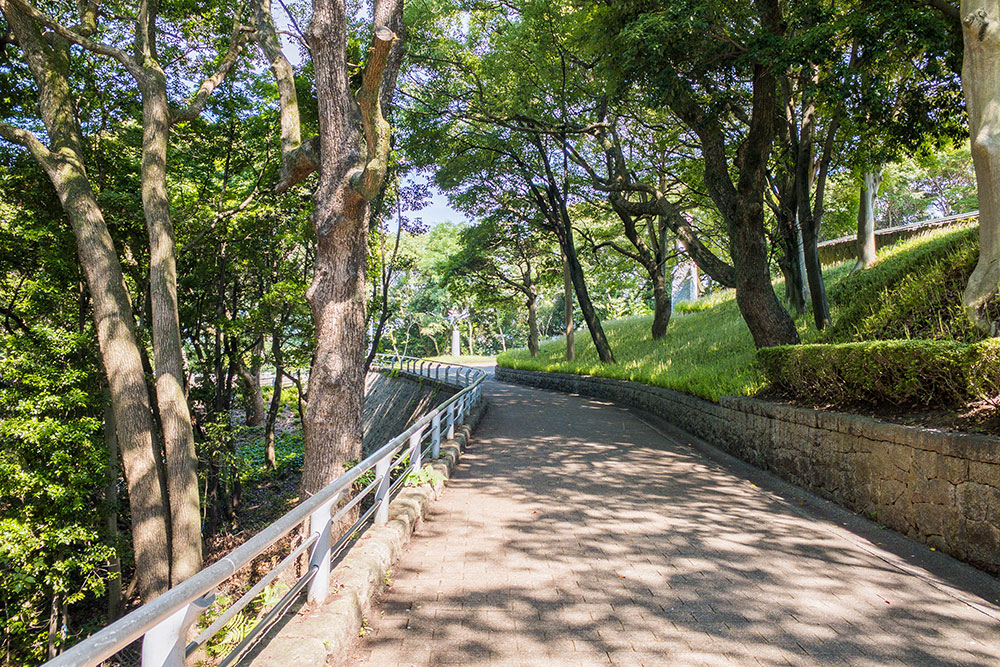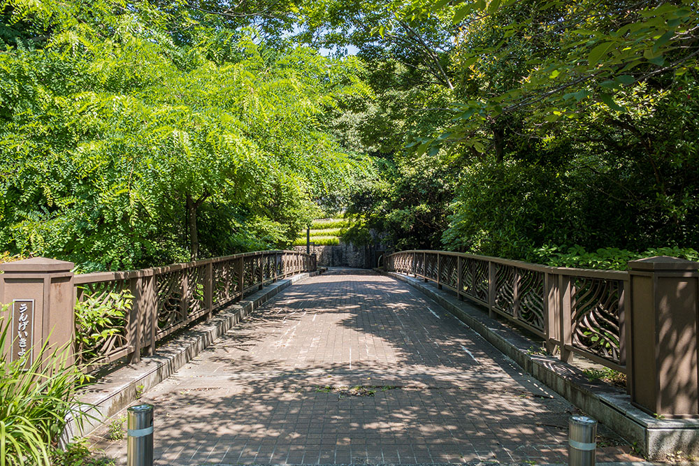 橋を渡ると、美術館の地下の部分にあたる部分(公衆トイレがある)に突き当たり、そこを左に迂回するなだらかな坂道が美術館の正門へと続いています。背の高い雑木林の緑に囲まれ、爽やかな気分になります。