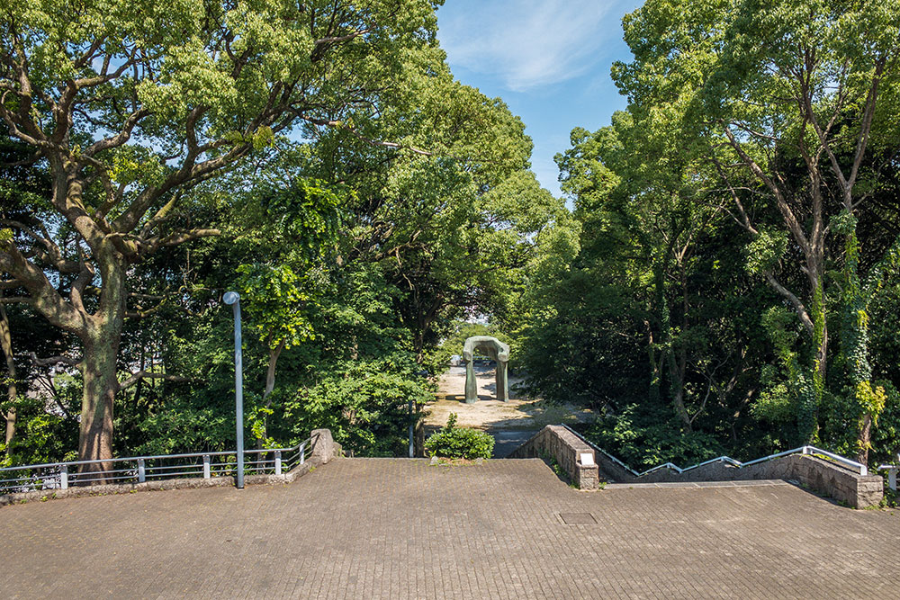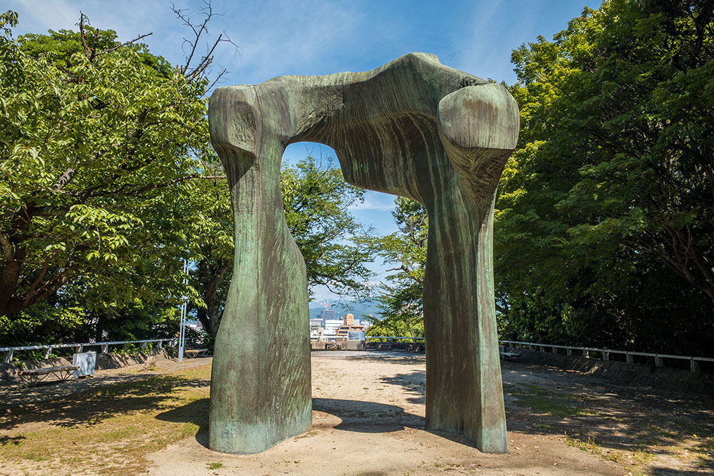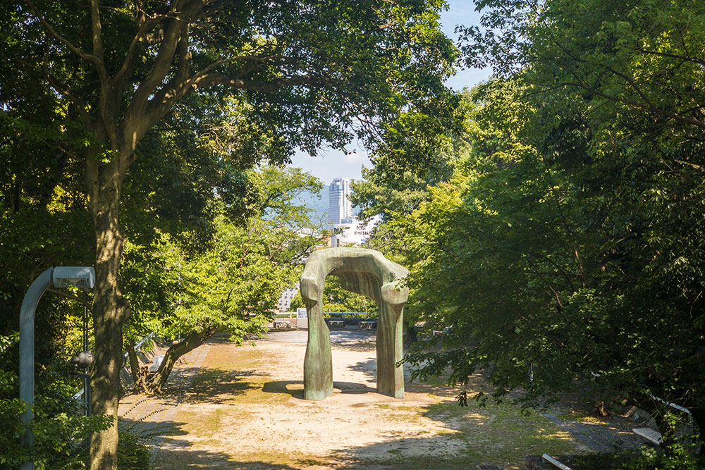 ブロンズでありながら、有機的で味わい深い造詣のこの作品。アーチをくぐった先の広場からは、広島の街を一望できるようになっています。