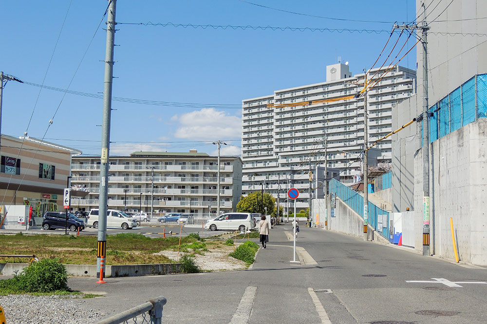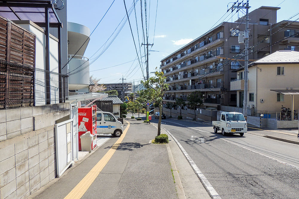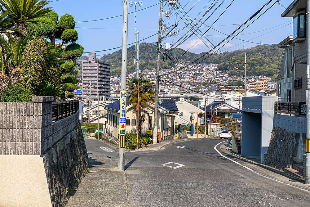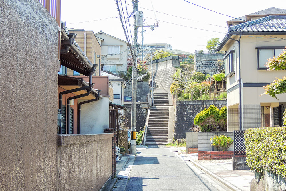 戸建て住宅やマンション、アパートなどが立ち並ぶ住宅街で、斜面の上の見晴らしの良い場所には高層マンションが多く立ち並んでいます。