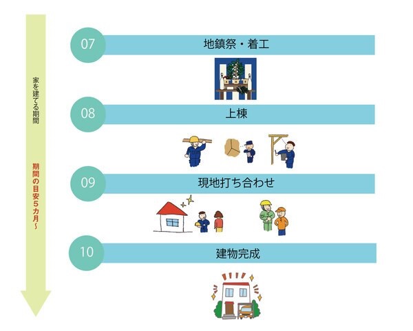 期間の目安:5か月~ 地鎮祭・上棟・現場打ち合わせ・建物完成