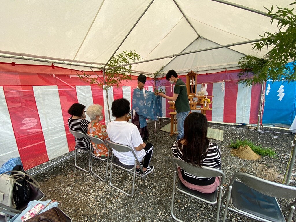 住宅の建築工事から完成までの期間はおよそ5か月。まずは、着工前の打ち合わせを行ってその後に建築などの起工に先立ち、 その土地の神を祭り工事の無事を祈る儀式「地鎮祭」を行います。家づくりのスタートとなる地鎮祭は家族の思い出となる大きな記念行事となります。