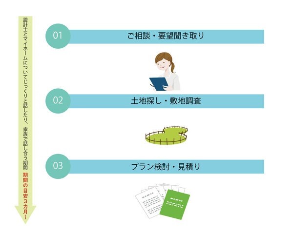住宅建築のファーストステップ、相談から見積もりまでの期間はおよそ3か月ほどです。理想の暮らしは十人十色。住宅を建築するにあたり、 土地のことやお金のこと、家のことなど不安や気になるポイントは人それぞれ違います。まずは、住宅会社やハウスメーカー、工務店に行き、 建てたいお家のイメージや要望をスタッフの方に相談してみることをおすすめします。相談は無料で行っているところが大半なので、土地のプロ、 設計士、お金のプロなどそれぞれに詳しい専門家にまずは聞いてみましょう。