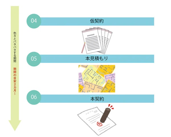 見積もりが決まったらここからはおよそ2か月ほどかけて仮契約、ローン仮審査、本契約、各種申請手続きなどを行っていきます。