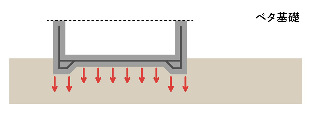 ベタ基礎とは、家の基礎の一種で、家を支える底面を全て鉄筋の入ったコンクリートで覆い、面で家の重さを支える基礎のことです。