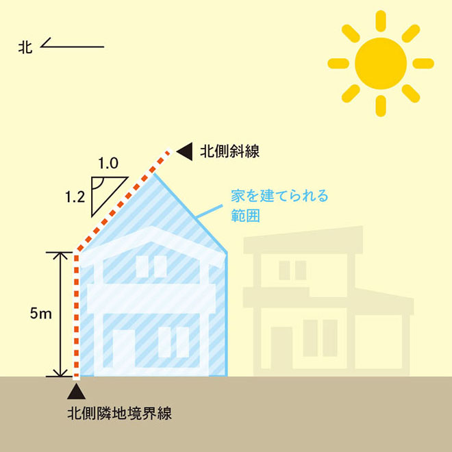 北側斜線制限は、建築基準法で定められた建物の高さを制限する法規のうちの一種。その家の北側の隣地の日当たりが悪くなることを防ぐための法規です。