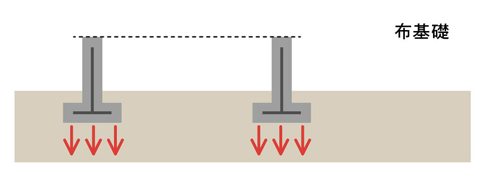 布基礎も家の基礎の一種で、こちらは複数の鉄筋コンクリートの柱で家を支える基礎です。底面全てを使って支えるベタ基礎と比べ、いわば「点」で家の重さを支えるため、重さが柱の部分に集中するため、ベタ基礎と比べて耐震性では不利に。また、ベタ基礎と比較すると湿気やシロアリの被害を受けやすいと言われています。