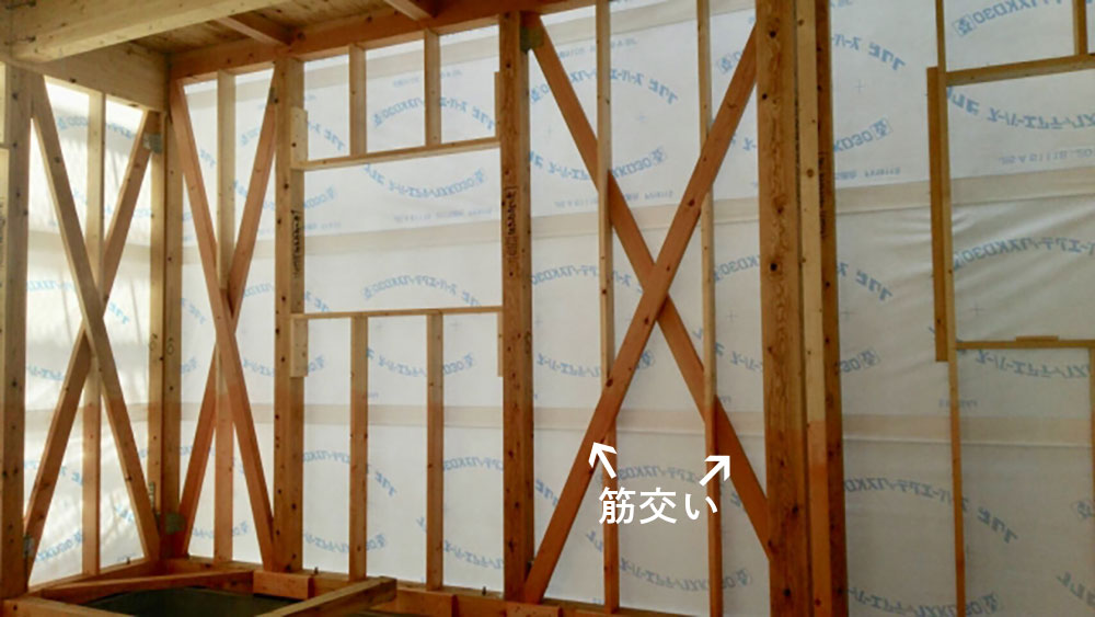 筋交いとは、柱と柱の間に、斜めに入れることで構造を補強する部材のことです。