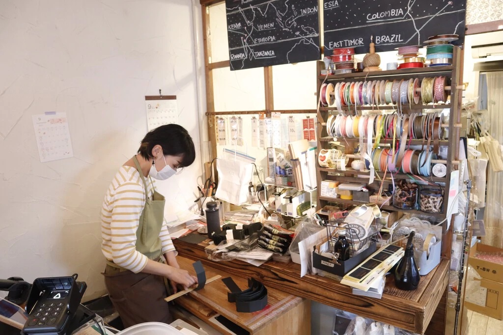 お客さまが喜ぶことはすべて自分たちの手作業で行いたいというのが深川珈琲さんの考え。ギフトに使用するリボン一つとっても、コーヒーの種類と同じくらいたくさんの数が置かれていて、ギフトを渡す側にもリボンを選ぶ楽しさを与えてくれます。
