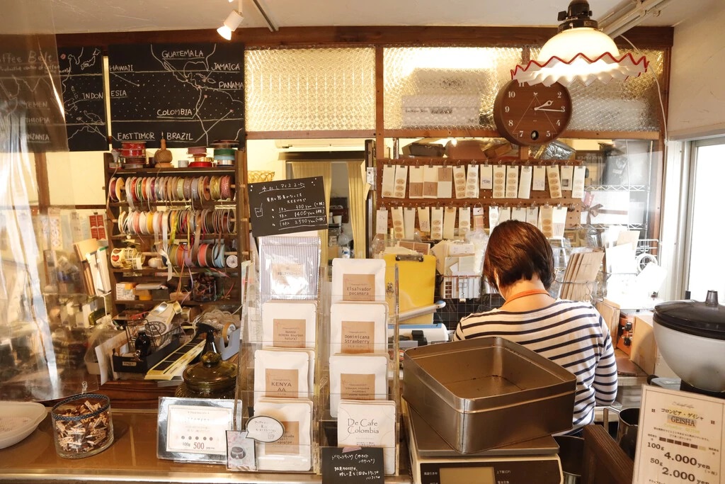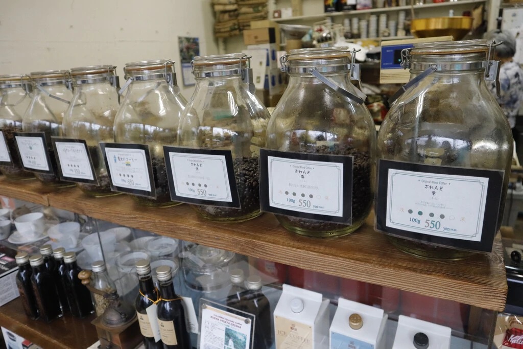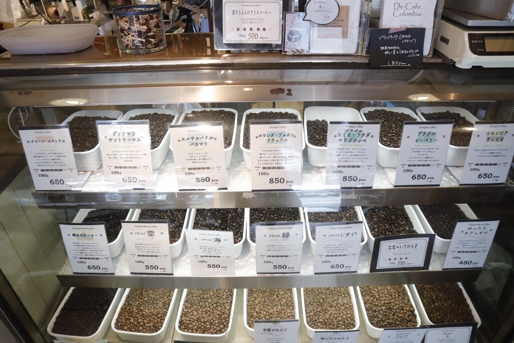 店内に入ると、まず目に飛び込んでくるのがカウンターケースにびっしりと並べられたコーヒー豆の数々。浅煎りから深煎りまで幅広いラインナップは、”お石~いブレンド”や”魔女のコーヒー”など、どれもネーミングが面白く親しみやすい印象。