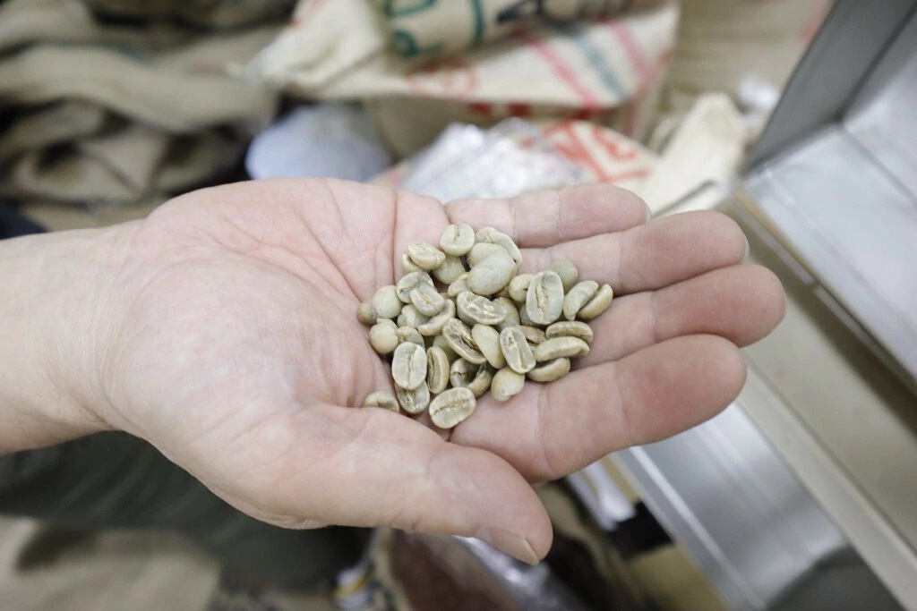 1号店の一角にある山積みにされたコーヒー豆の麻袋には、世界中から集まった希少価値の高い豆が入っていて、少しずつ少しずつ大切に焙煎された後に不定期でひっそりと店頭に並びます。生のままだと、まるで芳醇な果実のような香りがするこれらのコーヒー豆は、石焼焙煎されるとストロベリージャムのように甘い味わいになるのだそうです。