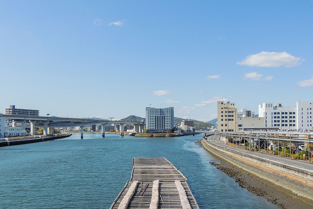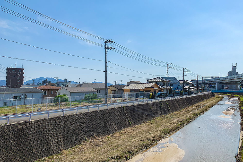 本町の北に位置する鶴江(つるえ)。府中大川(ふちゅうおおかわ)沿いの開放的な空間が広がる住宅街で、戸建てやアパートなどが立ち並び、賃貸物件も豊富。