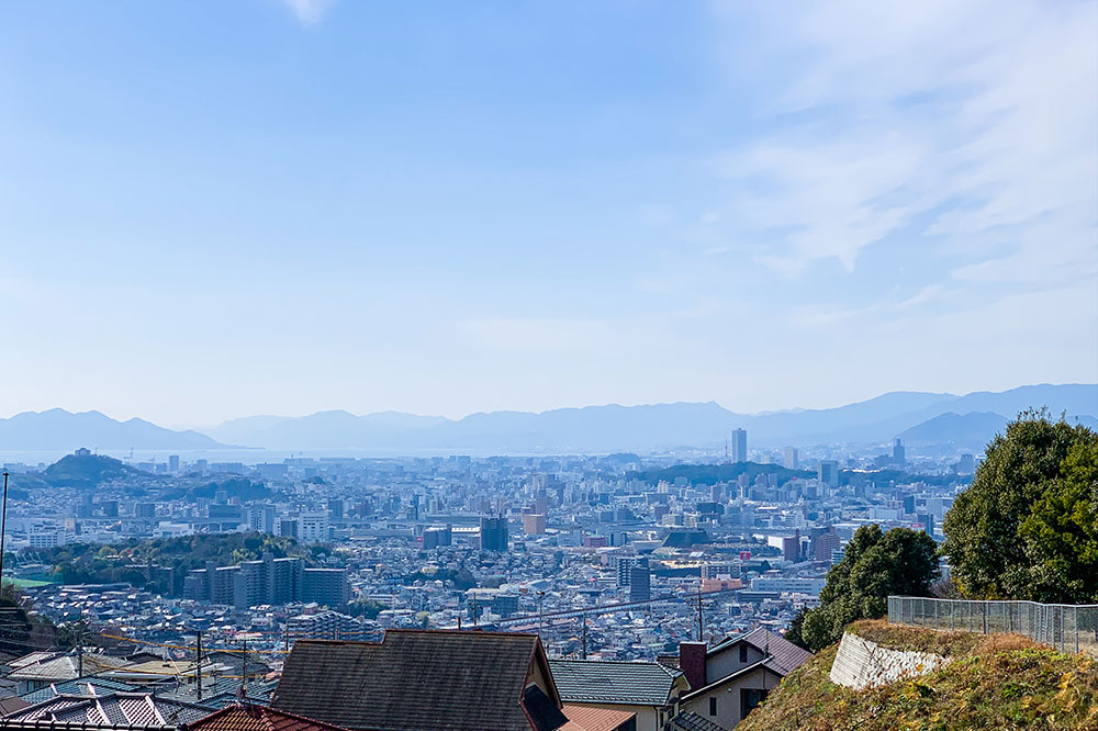 浜田本町の東の八幡(やはた)は、平地から高台にかけてのスロープ状のエリア。西側の平地では各地への移動や買い物などが便利になっています。高台はやや坂道が険しい場所もあるものの、府中町や広島市一帯を一望できる美しい景色のある生活を送ることができます。