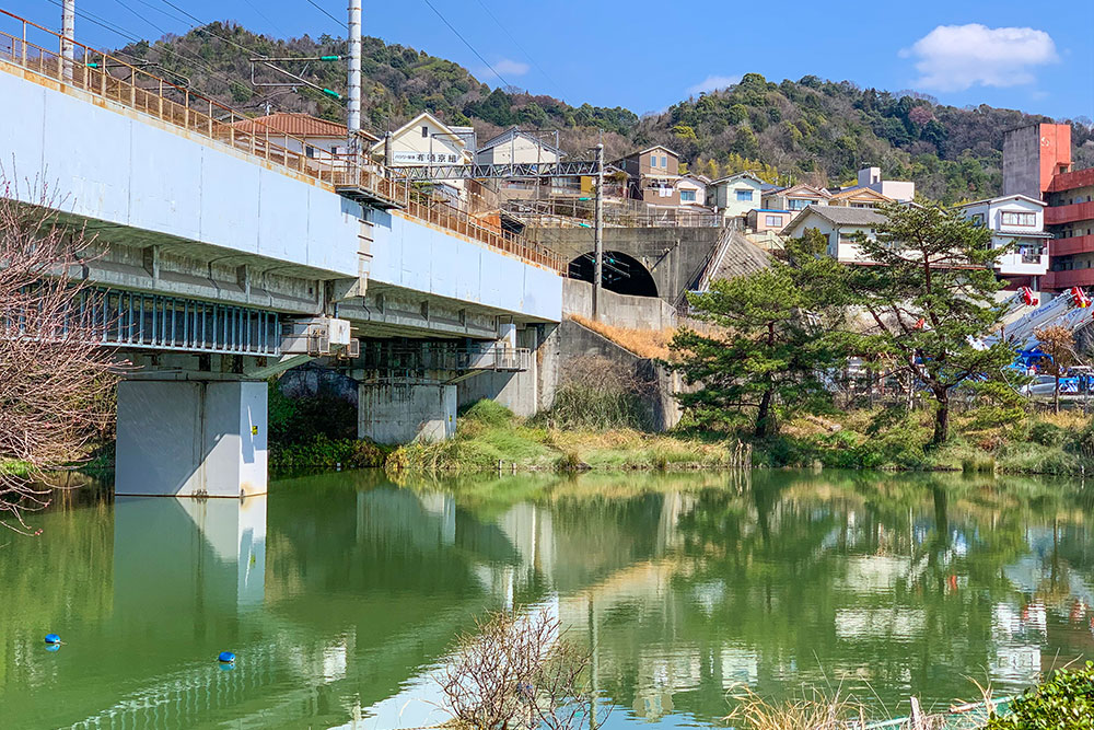 八幡の高台では、山陽新幹線のトンネルの出入口があり、住宅街に向かって新幹線が吸い込まれて行くような珍しい風景を見ることもできます。