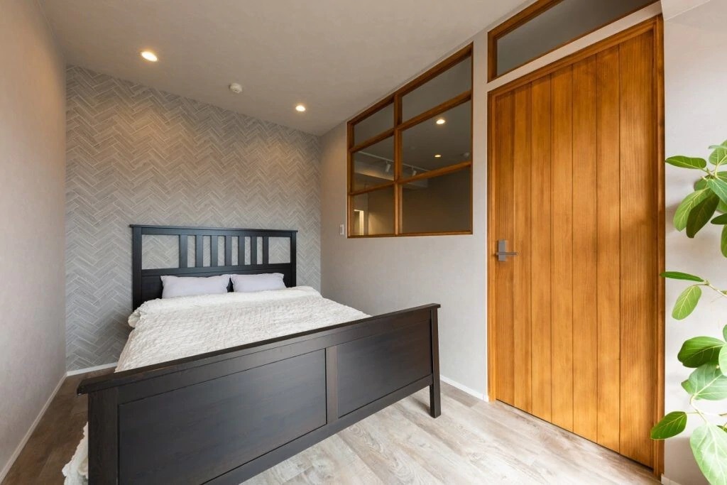 一日の疲れを癒す寝室では、落ち着いたトーンのアクセントクロスを使用するのがおすすめです。なるべく脳の刺激にならない色を選ぶことと、色の効果を利用することで安眠効果を得ることができます。北欧らしい幾何学模様でも、写真のようにライトグレーのような彩度の低いものであれば視覚の邪魔にならず、安心感や緊張緩和の効果をもたらしてくれます。