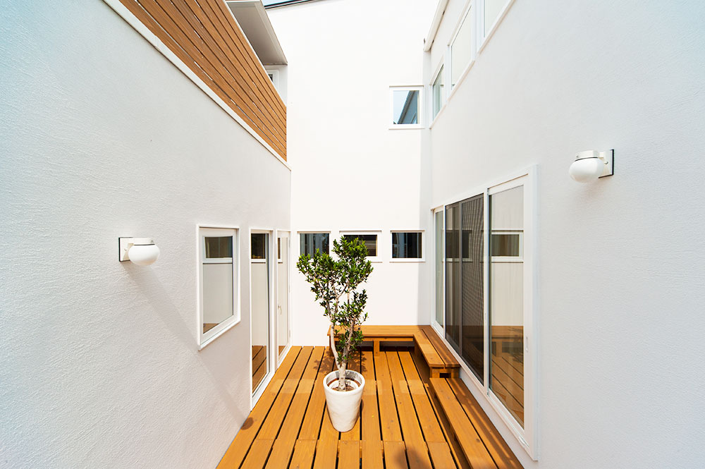 他の建物の影響を受けず、効率的に室内に空からの明かりを取り込むことができます。また、中庭は家族だけの完全なるプライベートスペース。道路に面している通常の窓や掃き出し窓は、通行人の目を気にして日中はカーテンやブラインドをしなければならないこともありますが、中庭の窓に関しては日中は全て開けておいても問題ないかもしれません。