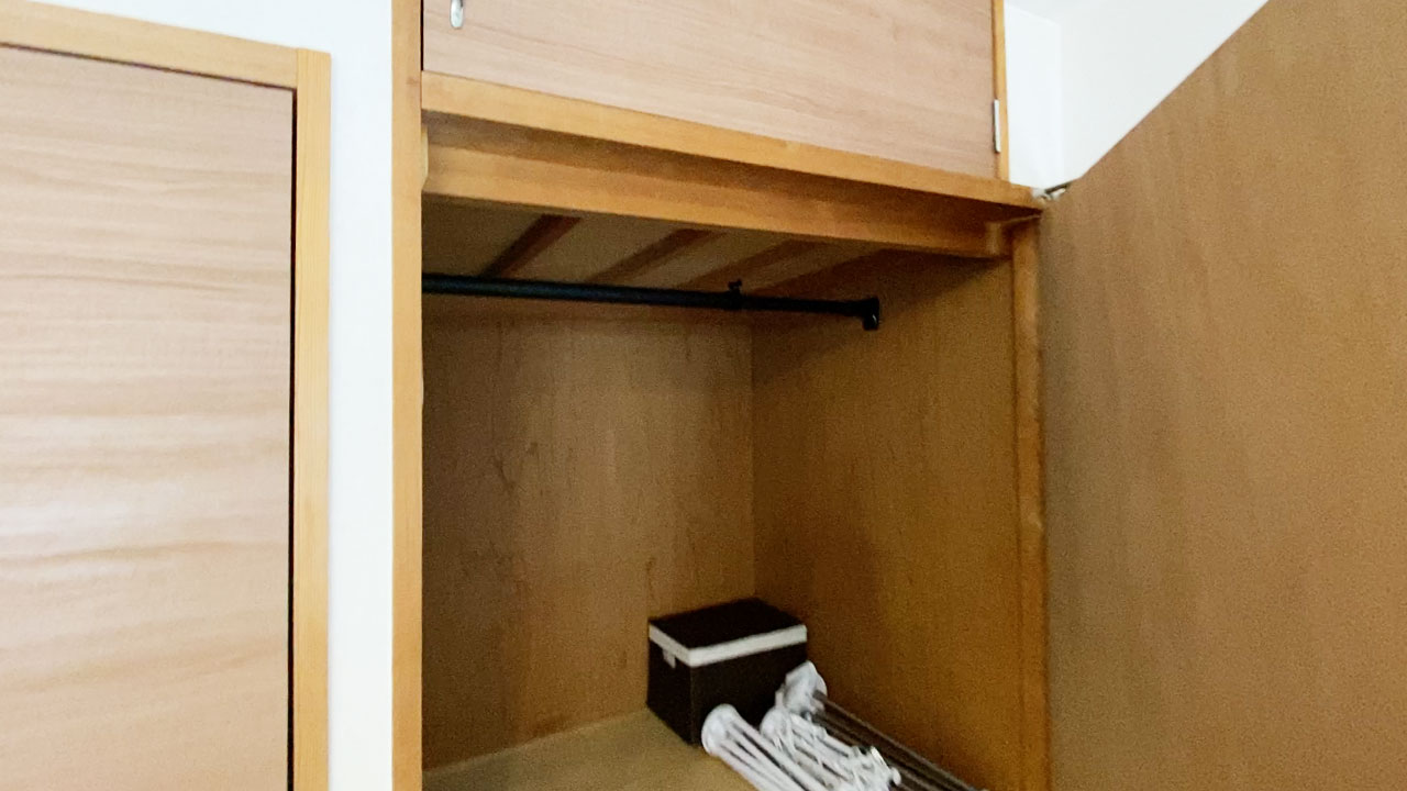 収納もたっぷりとあり、上の段のハンガーパイプに上着を掛けておくこともできます。洗濯用のハンガーや洗濯バサミなどもここに格納されています。