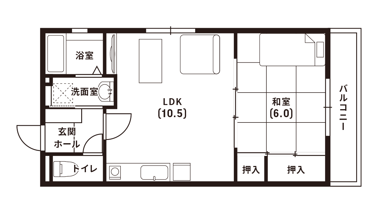 広島駅や広島市中心部の紙屋町(かみやちょう)、八丁堀(はっちょうぼり)に近く、最近では高級住宅街としても人気が高まっている広島市南区「段原(だんばら)」にある1LDKのお部屋。10.5畳の広々としたLDKと、バルコニー側の和室は引き戸で仕切られており、開放すれば一つの空間として使えます。