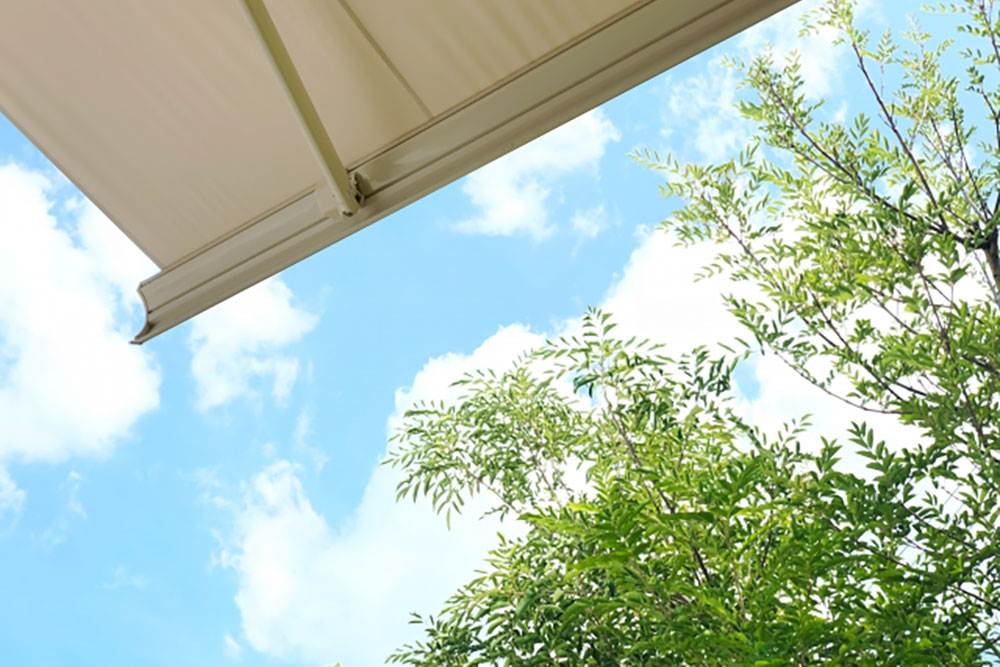 道向かいや遠方に自宅のある階よりも高い高層マンションやオフィスビルなどがあると、自宅のベランダが上から丸見えになっていることもあります。そんな上からの目線を遮ってくれるのが、オーニング(日除け)です。元々、オーニングはカフェや商店などの店先でよく見かけるアイテムで、直射日光を避ける日除けとして使われています。