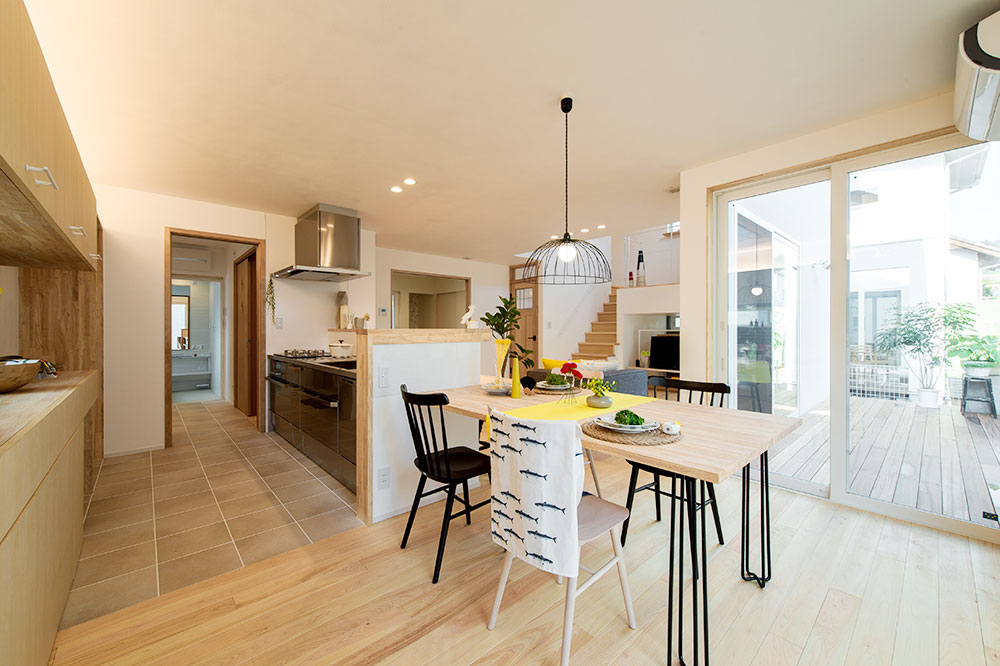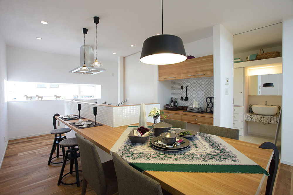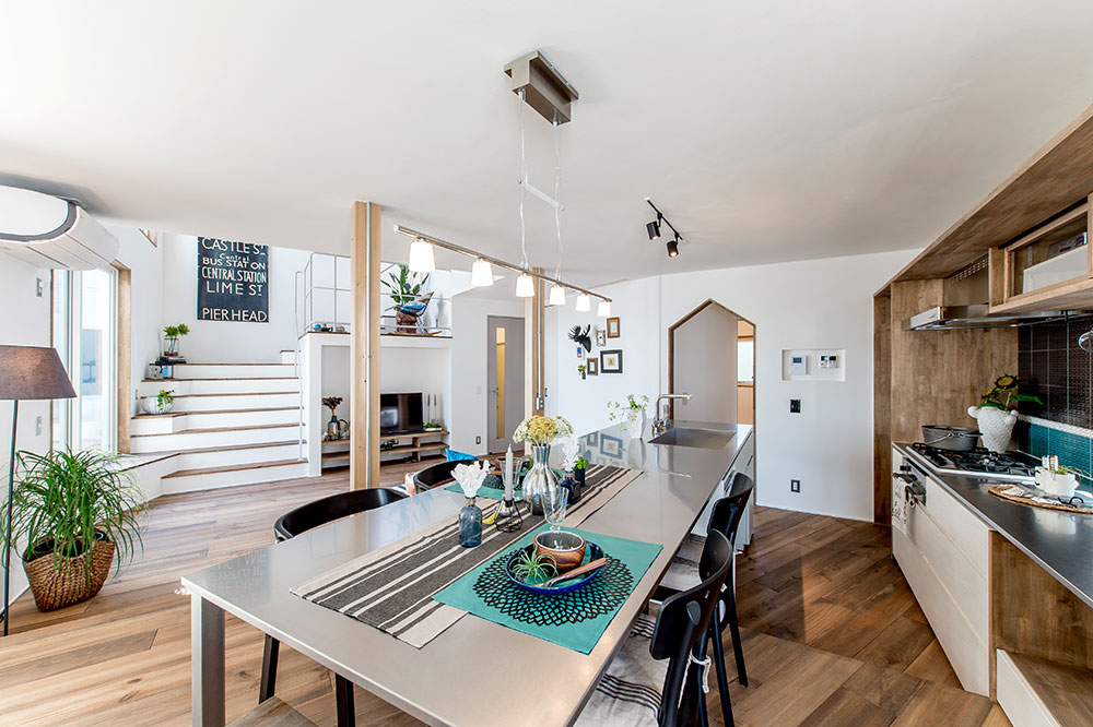 こちらはキッチンが柱のないアイランド型になっており、より開放感が上がっています。朝や日中はキッチン横の横長の窓から自然光が入り込み、家族の食卓を明るく照らしてくれることでしょう。天板の3隅を支えるアンティーク調の黒いアイアンの柱が、ナチュラルな空間にアクセントを与えています。