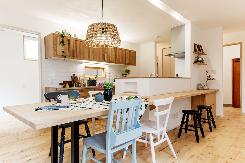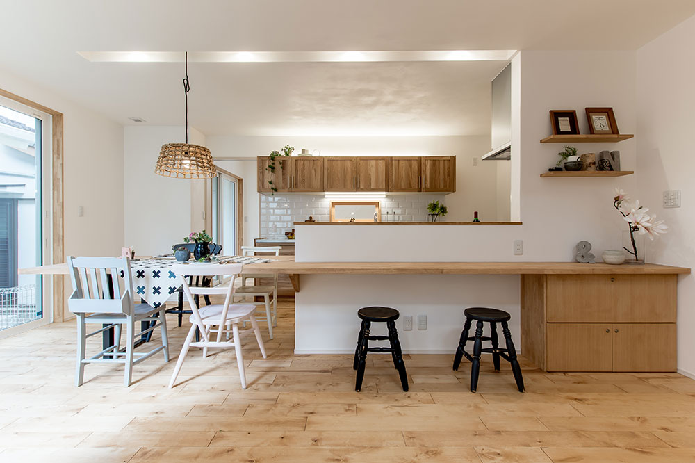 木の温かみが漂う対面キッチンに、一枚板でカウンターテーブルとダイニングテーブルを造作(既製品を設置するのではなく大工工事で作ること)で設置した例。