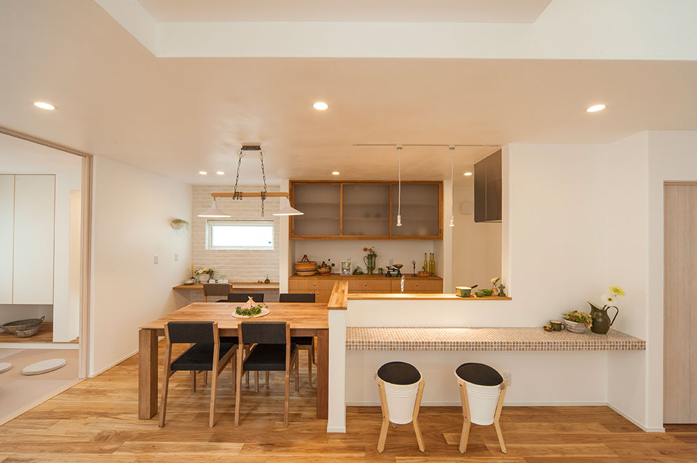 こちらはキッチン向かいのカウンターテーブルがタイルになっている例。造作による独特の質感を楽しめるカウンターです。キッチンカウンター横に、ダイニングテーブルをピッタリとくっつけられるような間取りになっているため、事例1と事例2のように一枚板ではないものの、一体感があります。